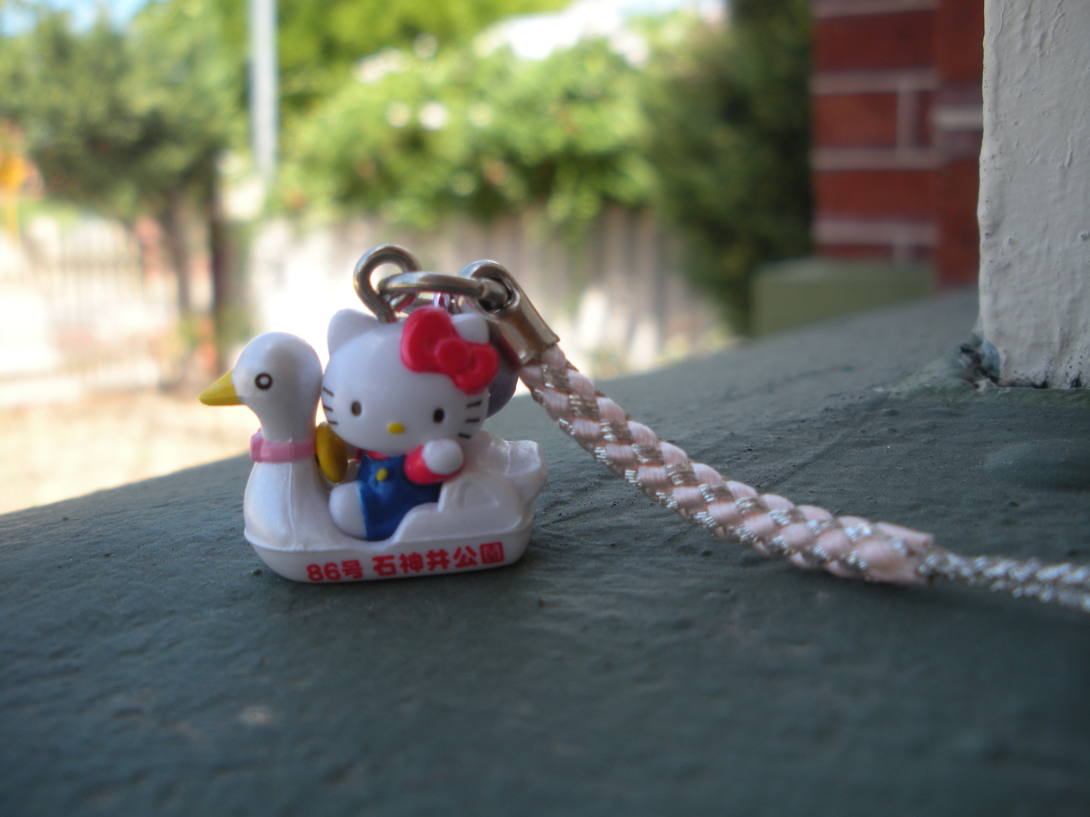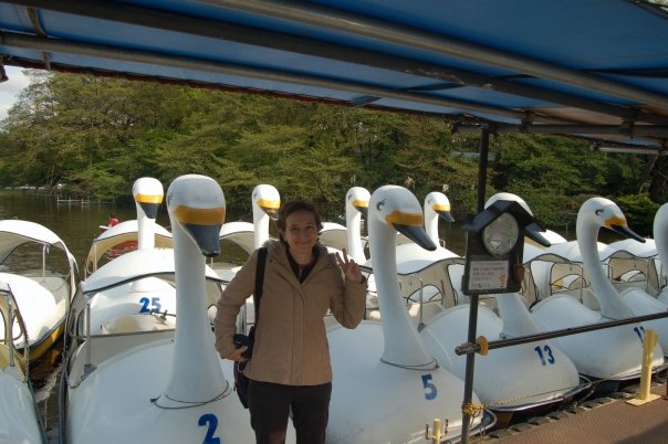 In 2005 I was disappointed I didn’t get a chance to go on a Swan boat. They seem to be on every lake in Japan. In 2007 I was determined not to miss my opportunity again, and got to go on one on the lake in Mitaka, near the Studio Ghibli Museum. It was exciting for a while, then it was just hard work. Here, Kitty re-enacts the excitement of cruising around a lake on a swan boat.