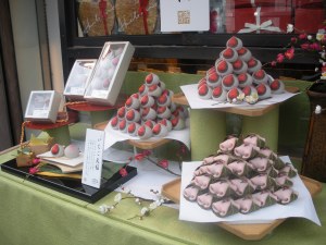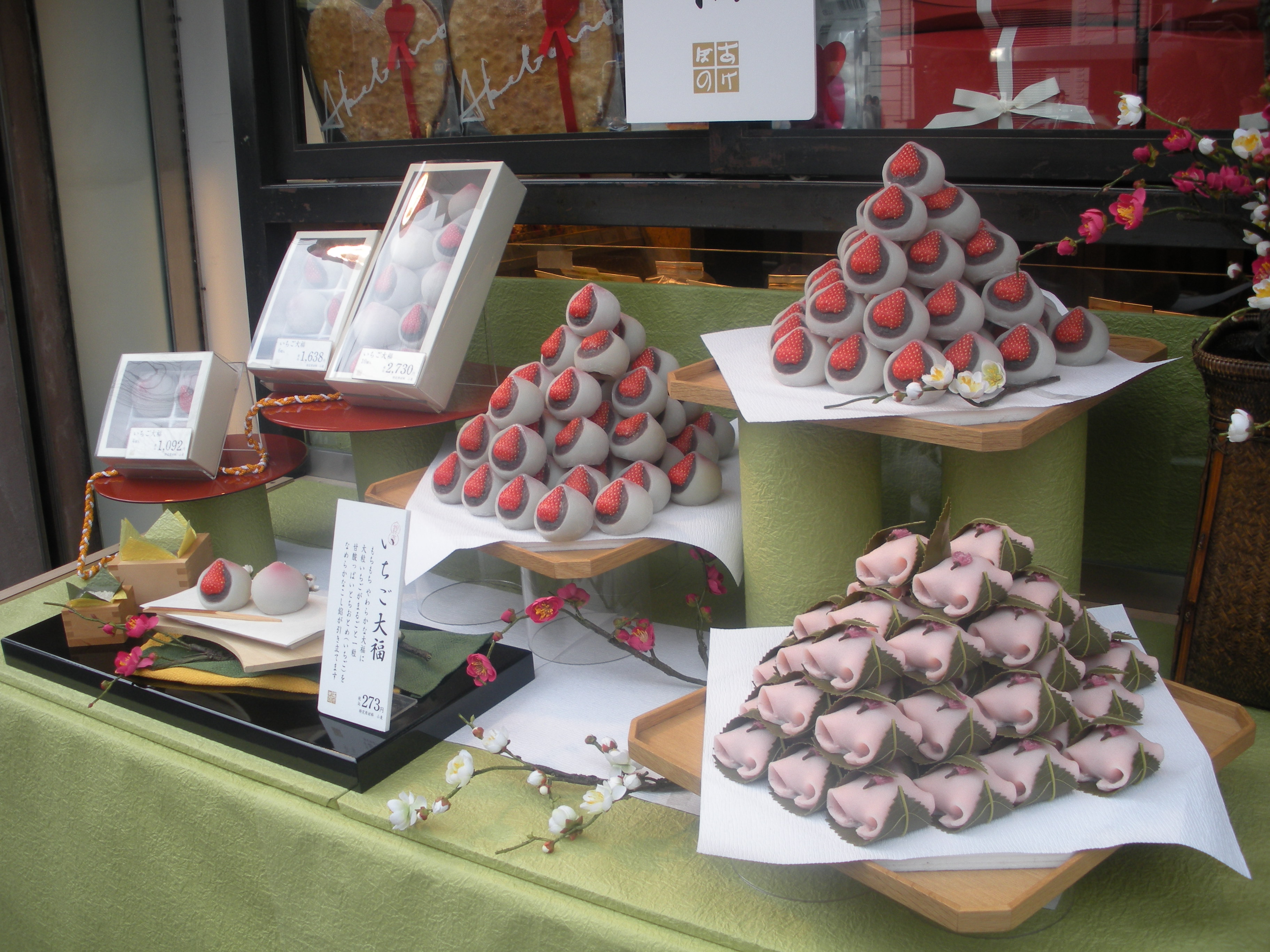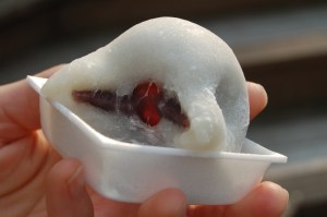 The photo above shows a plastic daifuku display in a shop window in Kyoto. The next photo shows a half eaten daifuku. Oishi!
