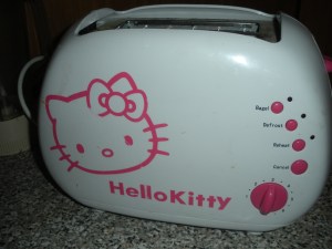 And finally, my Hello Kitty toaster. It actually leaves an imprint of Hello Kitty on the toast. Sadly, I don’t eat a lot of bread anymore these days so it doesn’t get used a whole lot. Still, it’s a nice surprise for guests.