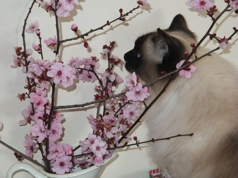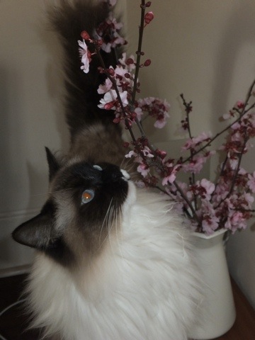 Spring has just started, and at the moment we have some beautiful cherry or plum (it’s hard to tell the difference) blossoms in our backyard. Before they all blow of in the wind onto the ground I thought I would snip off a couple of branches and bring them inside. Literally within minutes of putting them in a vase and placing them onto a shelf, our cat Yuki jumped up to investigate. She just can’t handle something being different and needs to know what everything is.