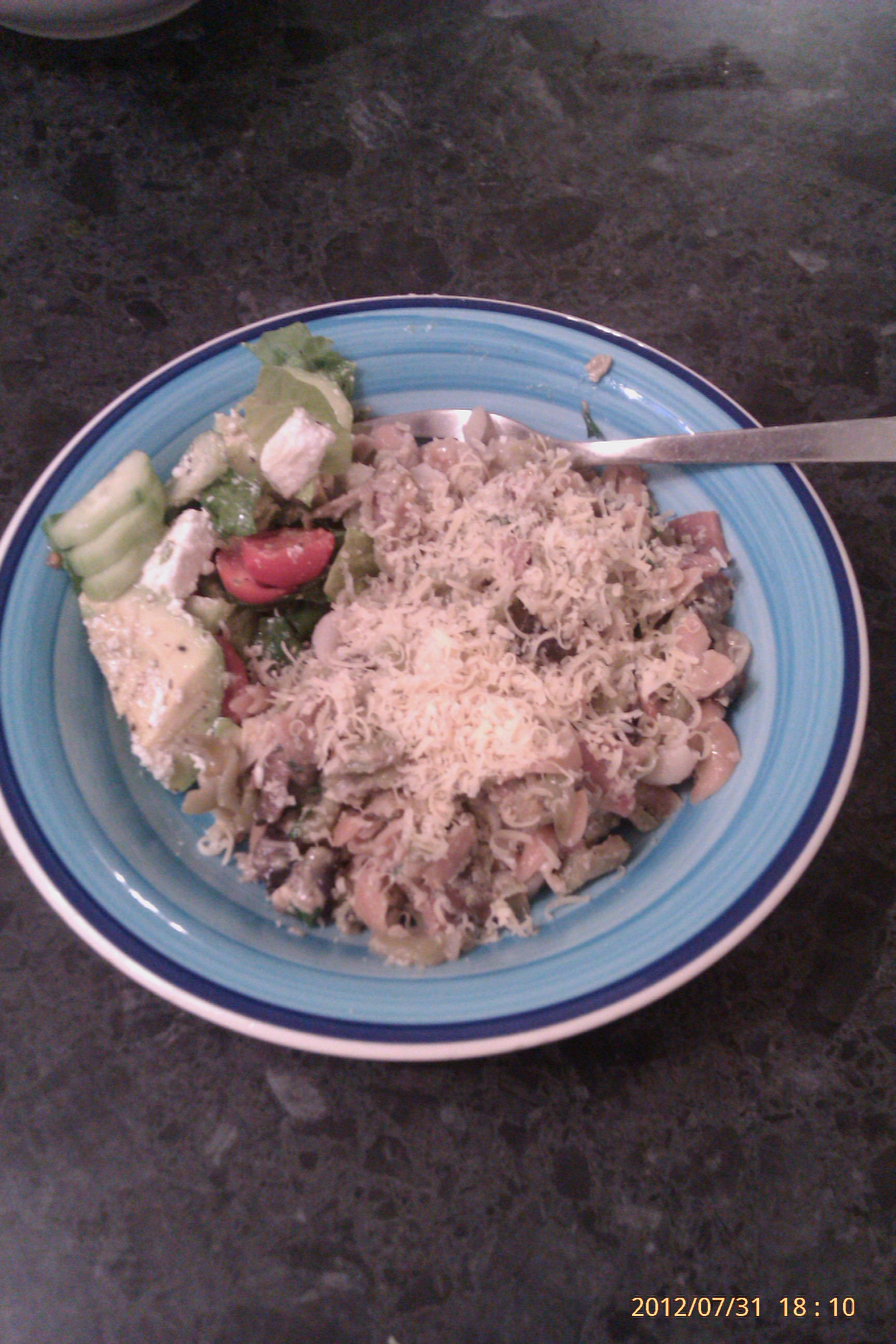 I was feeling rather exhausted after work on this day, so I called on my old standard meal of carbonara. I had some mushrooms on hand, so it ended up being bacon and mushroom carbonara. Made with gluten free pasta as I try to avoid wheat as much as possible.