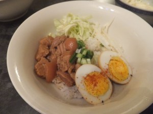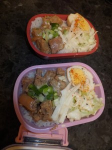 I’m mad for pork belly at the moment. Well, I actually have always been, but it seems to be a little more widely available these days, so I seem to buy it more. It’s cheap, and man, is it tasty. So this is Pork belly Kakuni donburi. Which translates as stewed pork belly on rice. The pork is cooked for a couple of hours in soy sauce, mirin, sake etc until it is as tender as…well something that’s really tender. I also put the boiled eggs in with the pork for the last 10 minutes or so, so they get all flavourful as well. Also, made the daikon radish salad again (that you may have seen on an earlier post) because it was so delicious. Yum!