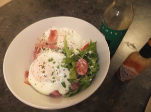I always seem to be exhausted on Tuesday’s. Something about it not being Monday and all, but still too close to the start of the week. When I really don’t feel like cooking, one of my staples is egg & rice. I recently bought a fab new recipe book entirely about Donburi, and it had a variant of my egg & rice. It was called the “Sunny Side Up Donburi” and, yes as the name suggests involves a bowl of rice with a fired egg on top. It also included ham, which was a delicious inclusion. I made up a quick salad of rocket & tomatoes, dressed with Persian feta (and the olive oil it is marinated in) and, there you have it. A simple, but satisfying dish.