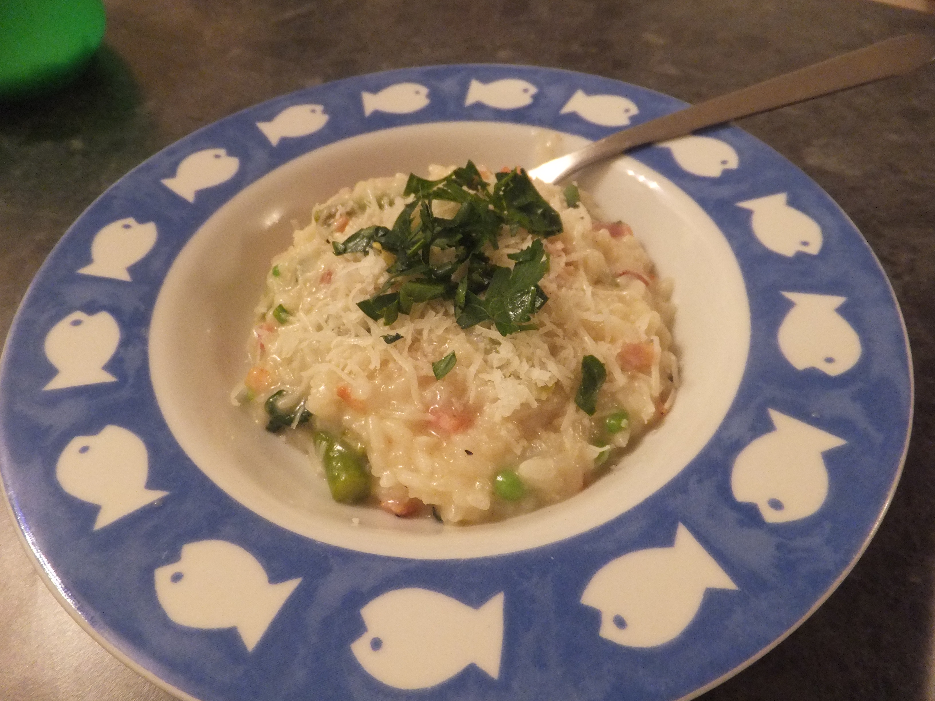 Risotto with asparagus, fresh peas, lemon & bacon.