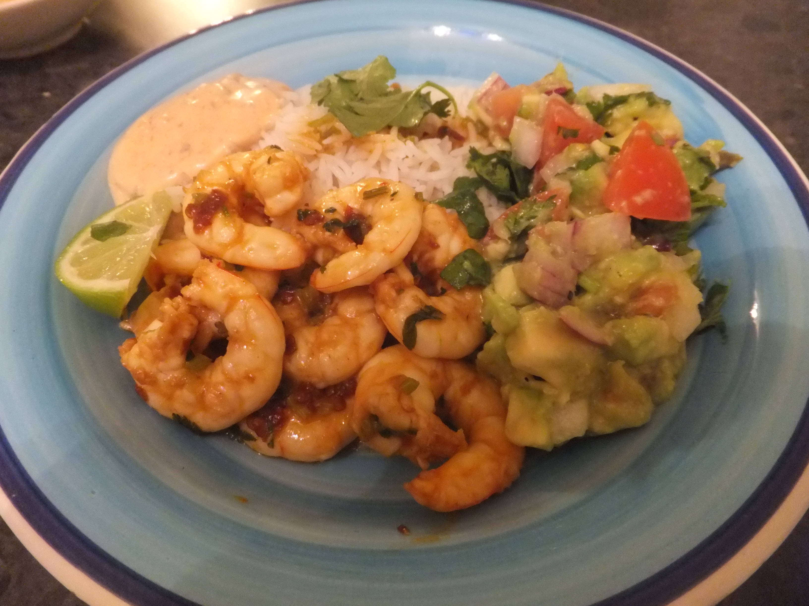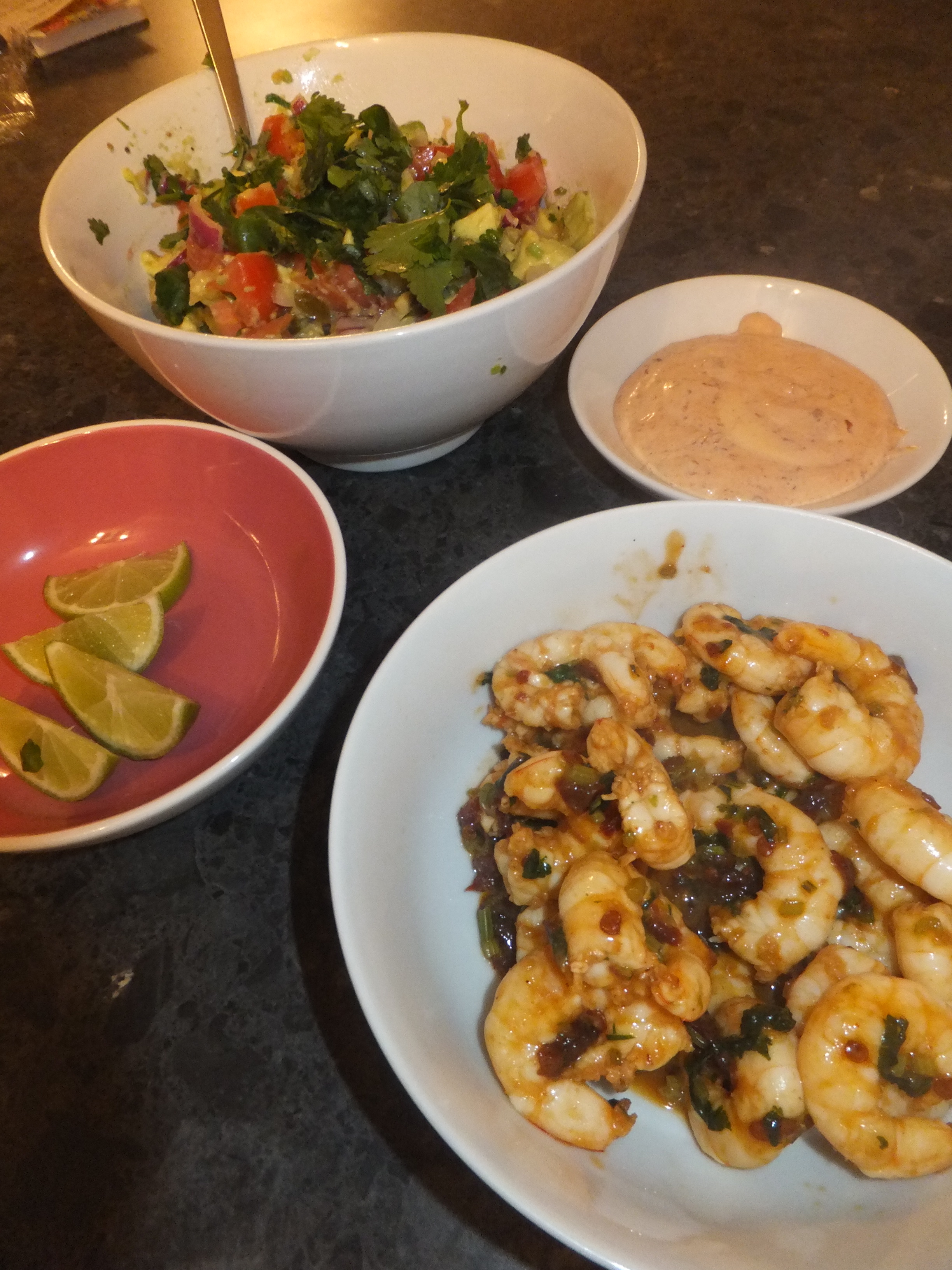 I so wanted prawn tacos tonight. But I couldn’t find corn tacos anywhere. So, this was what I came up with instead. Chipotle & lime prawns with guacamole, rice & chipotle mayonaise. Going to have to buy a tortilla press and make my own taco shells me thinks….