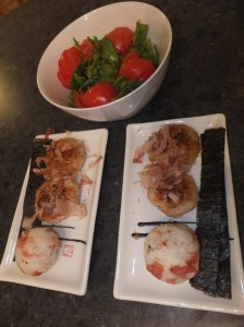 I didn’t know what to make for dinner tonight. Friday, end of the week, the fridge was looking pretty bare. So, I decided on Onigiri (just for a change). I was all ready to make plain rice & bonito or tuna onigiri, but an awesome new book I own (Simply Onigiri) put an end to that. So…here we have bacon & garlic onigri and toasted cheese & bontio onigiri. Both very tasty.