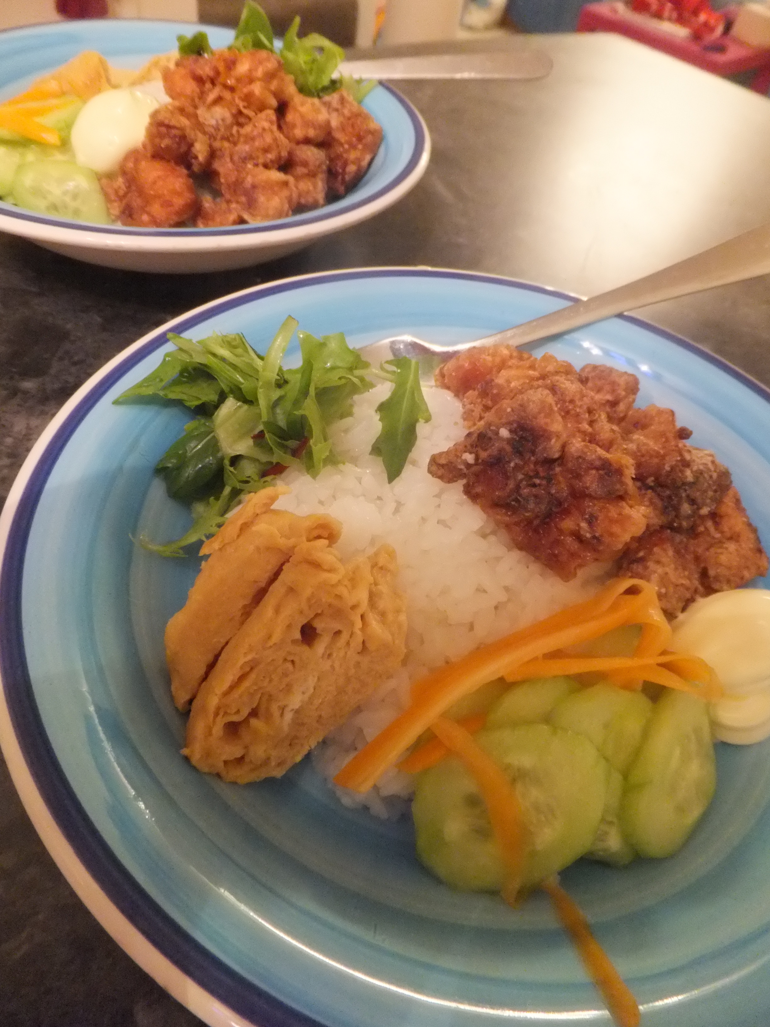 Karaage chicken donburi. With added tamagoyaki (Japanese rolled omelet) and cucumber pickles.