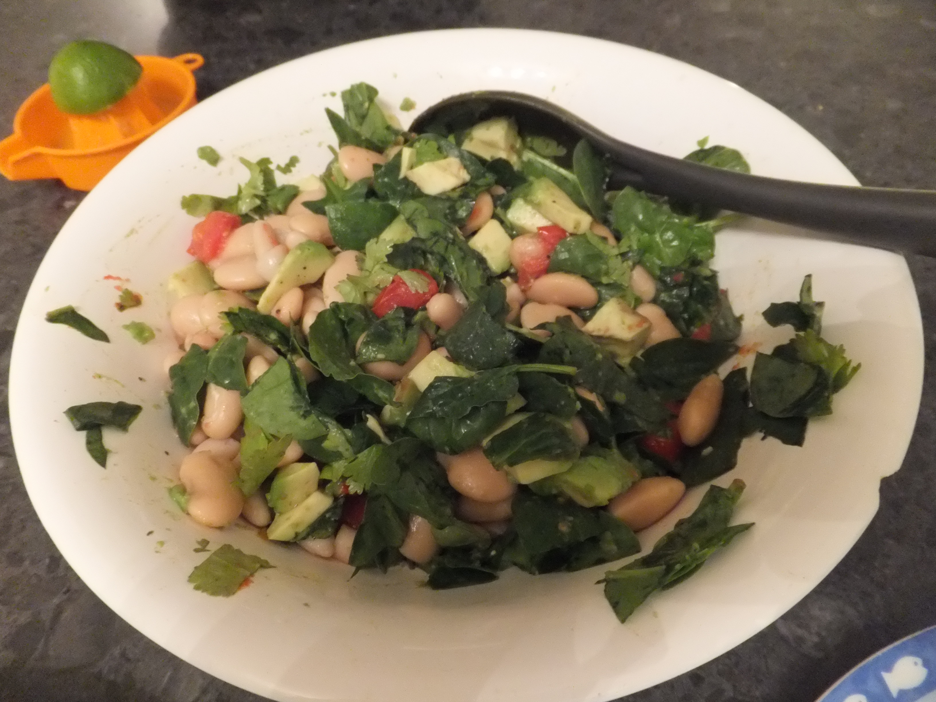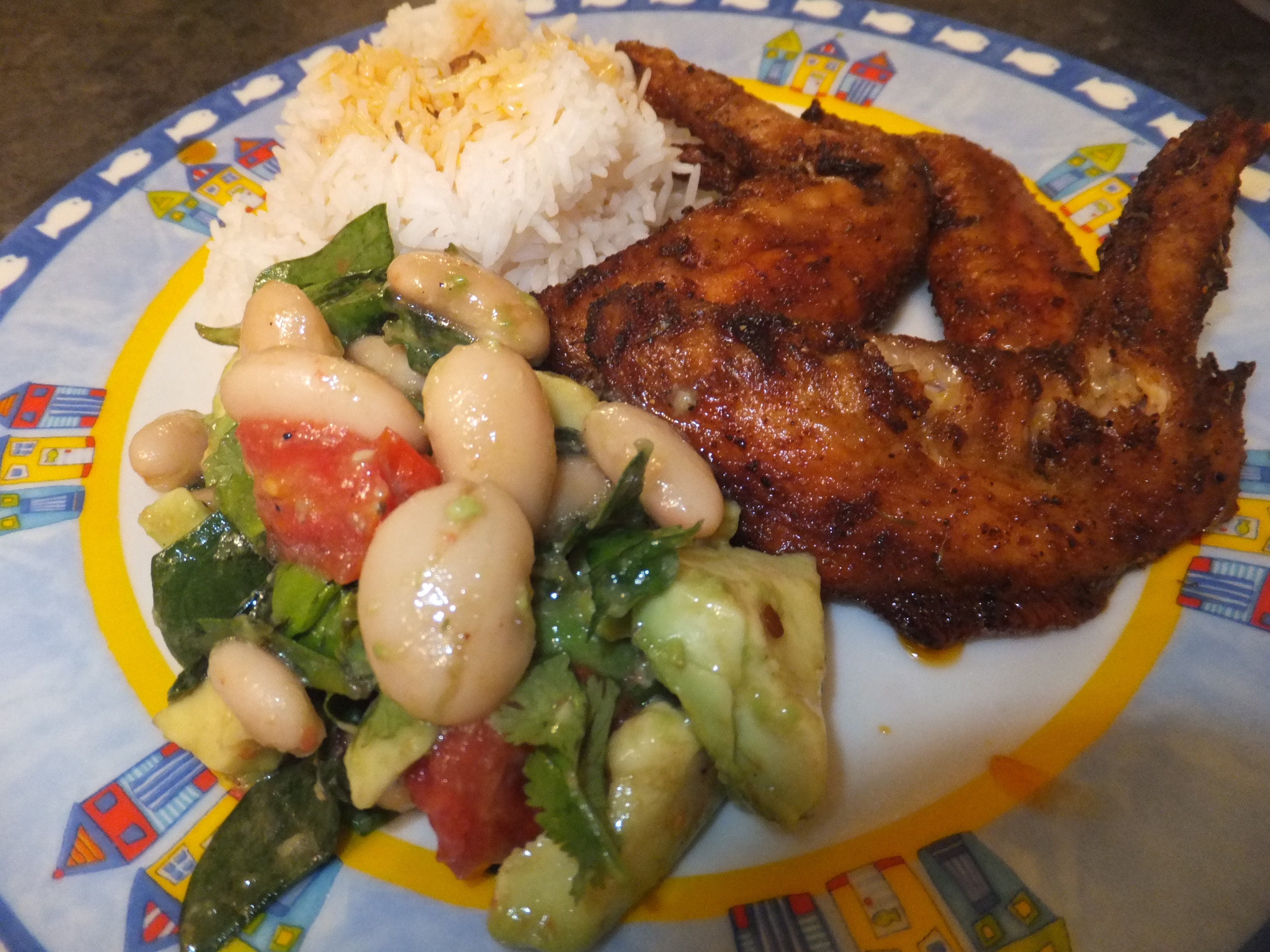 The salad is another slight modification of a Jamie Oliver recipe (I recently got a new issue of Jamie magazine) – sort of a Mexican inspired salad with avocado, beans, lime, chipotle…mmmmm chipotle…is there anything better? I think not. Then I made some chicken wings with various spices on them (including more chipotle) and some rice, because rice is always good.