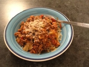 Today it is spaghetti bolognaise. Another thing I haven’t had in ages. Must be the week for it. Unfortunatly made with gluten free pasta, which is fine, but it just isn’t as good as the real stuff.