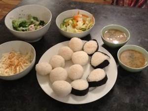 Japanese again. Salmon onigiri, daikon radish salad, broccoli salad, tsukimono and miso soup.