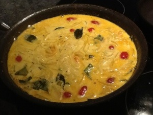 The spices and onions cooking up nicely. Unfortunately there was a slight incident with the mustard seeds getting a bit too hot in the oil which resulted in hot oil spitting into my eye. Ouch. I think I’m gonna be ok, I hope.