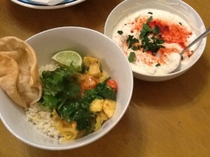 And the finished product with saffron infused rice, cucumber raita and Pappadums.