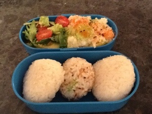 Onigiri n stuff. Can’t talk, gotta eat and go to German class.