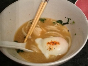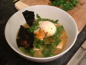 Miso udon soup with onsen eggs. If the onsen eggs worked that is. We will soon find out….