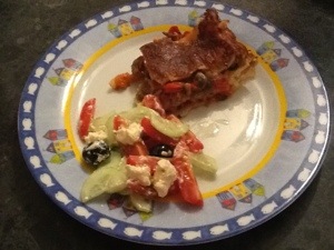 Leftover vege lasagne, lovingly reheated by Stephen whilst I was at yoga 🙂 And a Greek salad.
