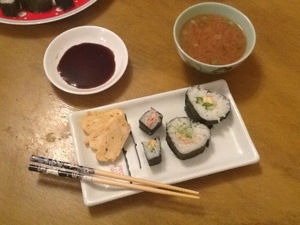 Made sushi. Haven’t made it for a long while, so they turned out pretty messy. I’ve got a cheating implement thing too so I don’t actually roll the sushi with a sushi mat. Still, I’m sure they taste fine though.