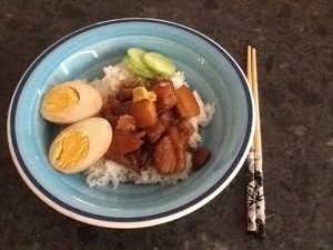 Okinawan Slow Cooked Pork on rice with an egg.