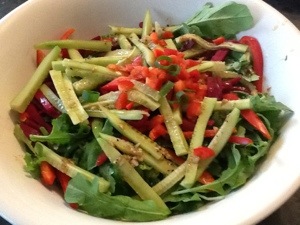 It’s meal is titled “Trying to use up whatever’s left in the fridge before leaving for Melbourne tomorrow”. And the result? A big mixed salad, potatoes cooked into wedges and steak.