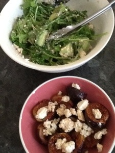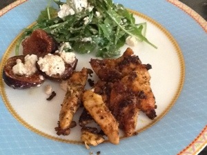 Apparently all we do these days is go and see bands. Tonight we are heading out again to see Norman Blake (from Teenage Fanclub) and Joe Pernice at the Perth Festival, which should be cool. Therefore, cooking up a quick meal with things I found in the fridge. Chicken flavoured with Louisianan Cajun spice (that I got at Gerwurzhaus on our recent trip to Melbourne), rocket & cucumber & feta salad and grilled figs with honey & feta. Super quick – it really did take all of 15 minutes!