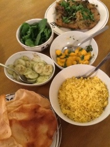 Kashmiri lamb chops with rice, pappadums, cucumber, mango etc