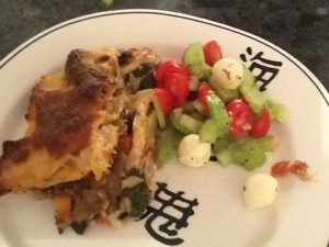 Leftover vege lasagne tonight. With a salad of tomatoes, cucumber, celery & boccincini.