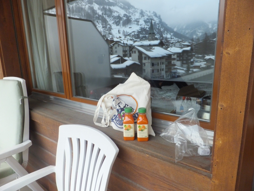 Well, it’s our final night in Zermatt already. Seems to have gone so quick. Being a little sick was a bit rubbish, but we have still had a fine time. We couldn’t resist another supermarket dinner in our room though. The supermarket is full of tasty goodies and its cold outside, so it’s a good option I believe.
