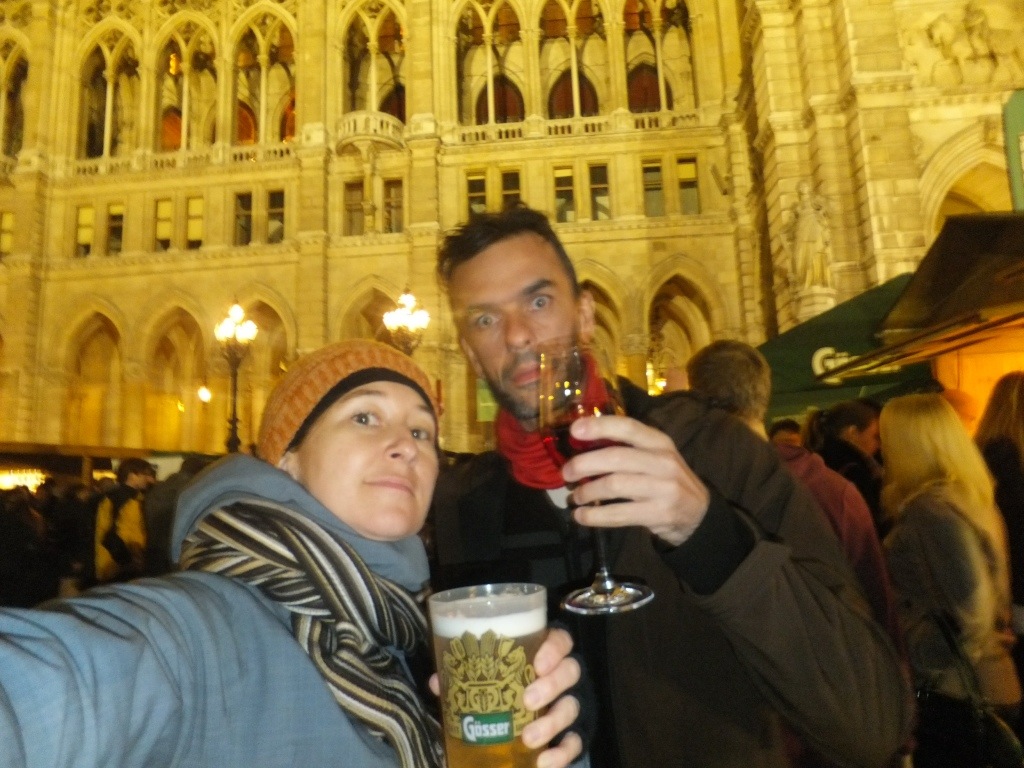 We had planned to go to an Austrian Beisl for dinner tonight, but whilst on the tram on the way there We noticed a whole lot of people outside the Rathaus. We had to get out for a closer look, and upon further inspection, we discovered it was a festival celebrating the Steiermark region of Austria. We decided to stay there instead for dinner, and had some beer and Leberkase and Späezle.