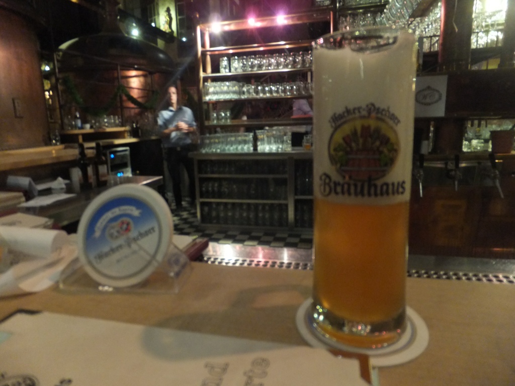 Dinner was difficult to get today. There was a soccer match on, and afterwards everywhere was incredibly busy. We went to multiple places trying to find food, only to be turned away or not let in the door. About 10pm, we eventually found a beer hall place near our hotel. Their beer was Hacker Pschorr. I enjoyed their beer. And I had Schweinsbraten (again) for dinner. I was starving and even almost ate all of it!