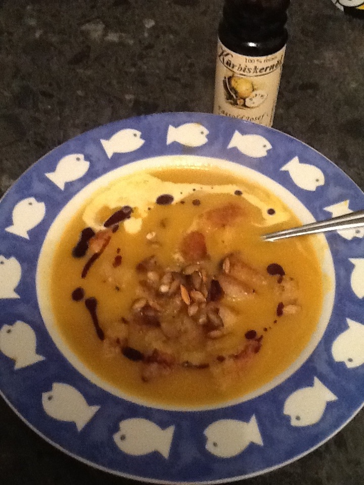 Leftover pumpkin soup from last night. (Drizzled with pumpkin seed oil that’s travelled all the way from Austria)