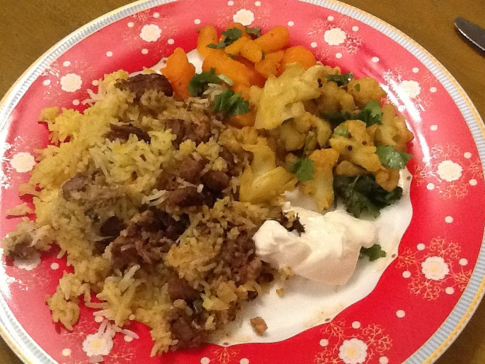 Lamb Biryani with spiced cauliflower and carrots.