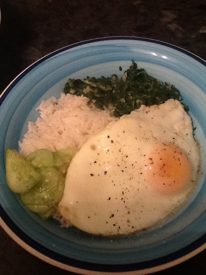 Anyway…dinner tonight is rice, eggs and spinach. I love this combination of foods. Real basic, but great. I recently discovered that this meal was a very common East German meal. How about that then?