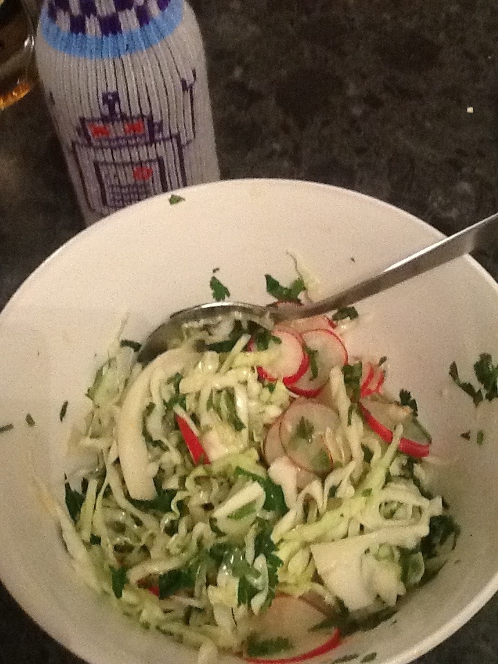 Again with the trying to use up stuff in the house. Vege quesadillas, cabbage and radish salad and chipotle corn.