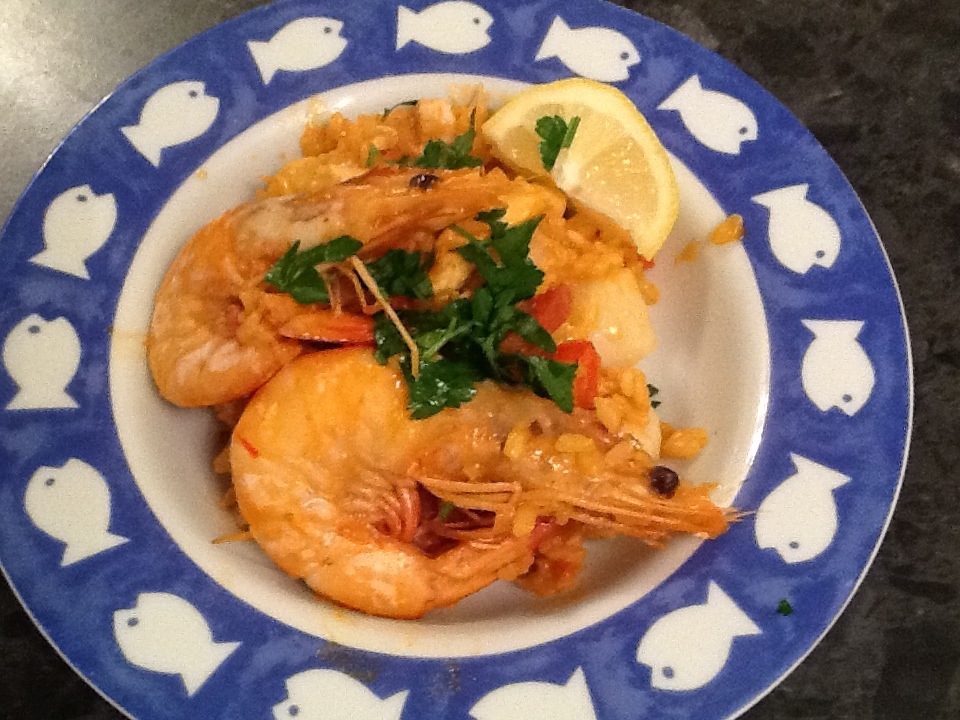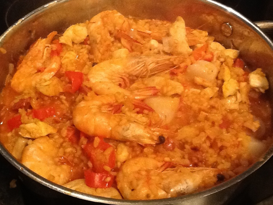 After not getting to have paella yesterday, we are having it today. It’s got fish, squid, prawns, scallops, chorizo, chicken and a whole lot of other stuff.