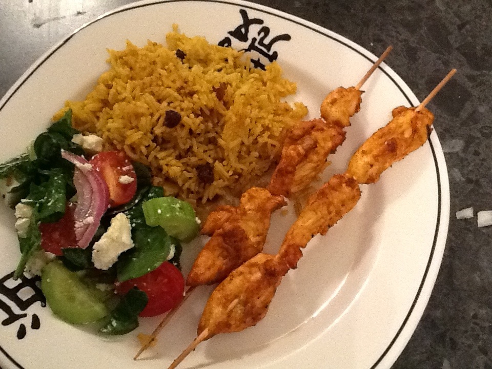 Spicy chicken skewers with rice pilaf and salad.