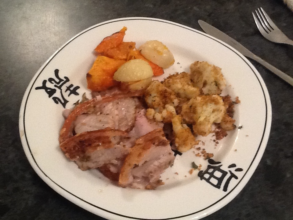 Roast pork with fennel & garlic with roast veges and cauliflower with breadcrumbs.