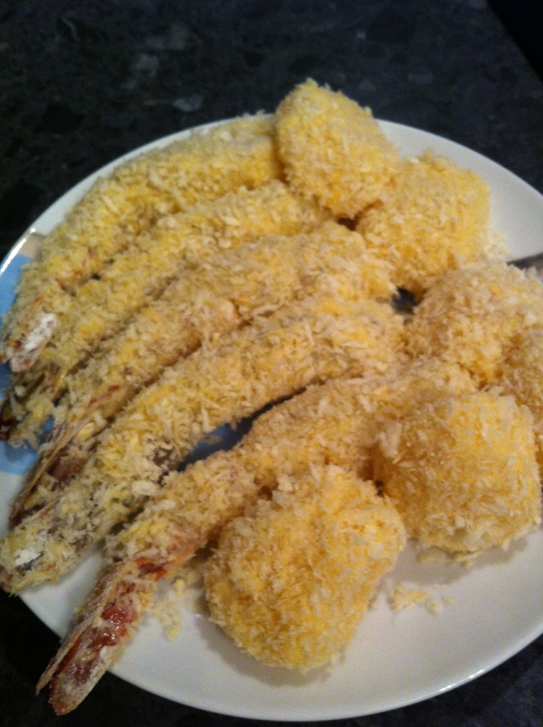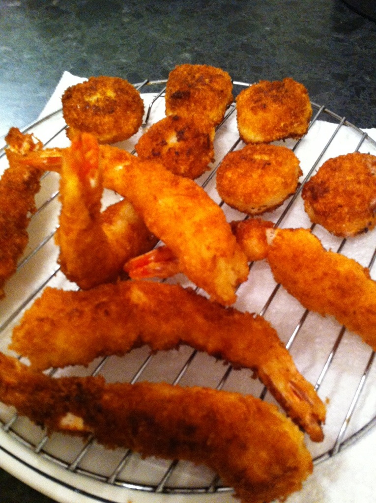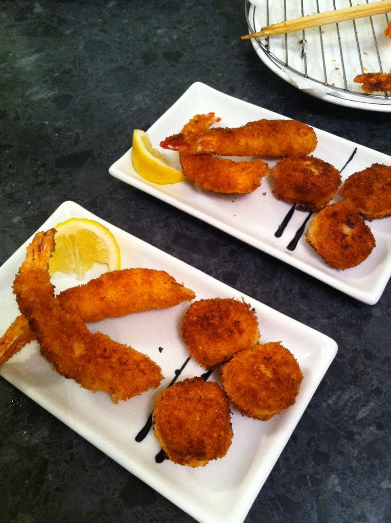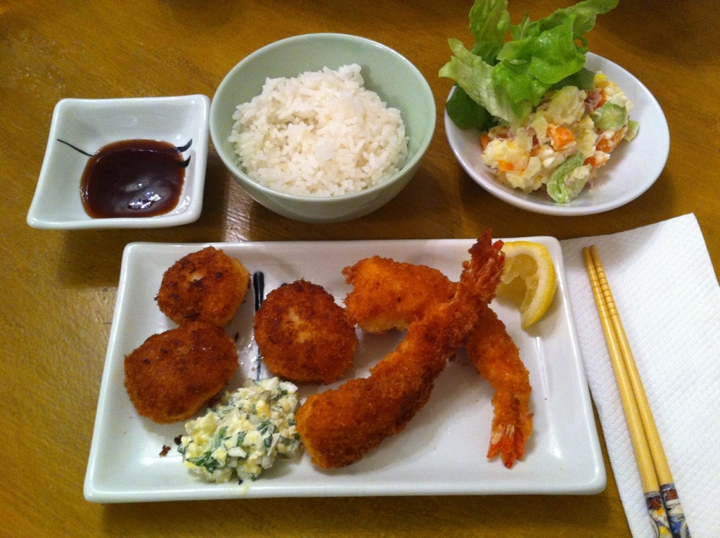 That translates as Prawn and Scallop fry. Basically Japanese style prawn cutlets really. Also made Japanese potato salad (ポテトサラダ) with rice and homemade tartare sauce. おいしい です ね!