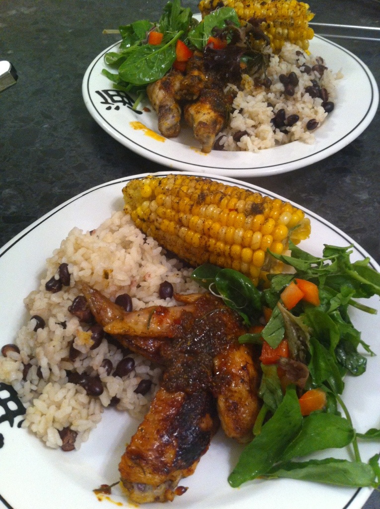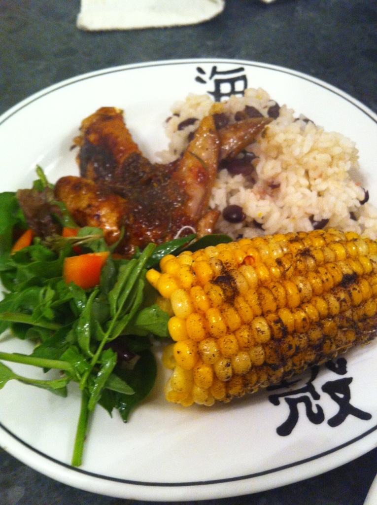 It’s another of Jamie Oliver’s “30 ‘Minute Meals” (truth be told, it took me longer than 30 minutes, but what do I care, cooking ‘s not a race) – I changed it up a bit with chicken wings (cos that’s what I had) instead of breast, put some chipotle on the corn (cos lets face it EVERYTHING is better with chipotle) and there we have it. Jerk chicken wings, rice with black beans, corn with chipotle and a tasty salad. Yum! ( I’m cooking up the leftovers for lunch whilst I write this)