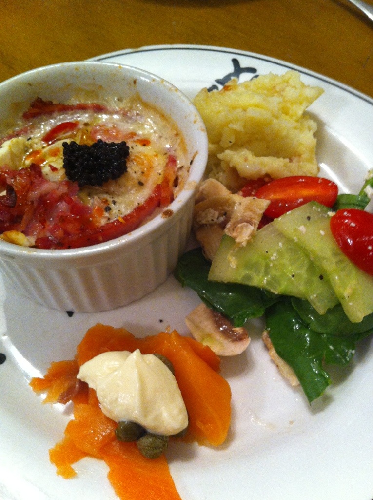 Tonight’s dinner was MEANT to be leftover corned beef, but as it was disgusting, we opted to throw it out instead. ( actually that’s a lie, it’s still sitting in the fridge and today’s Thursday) so..just made baked eggs, leftover smoked salmon and the likes for dinner.