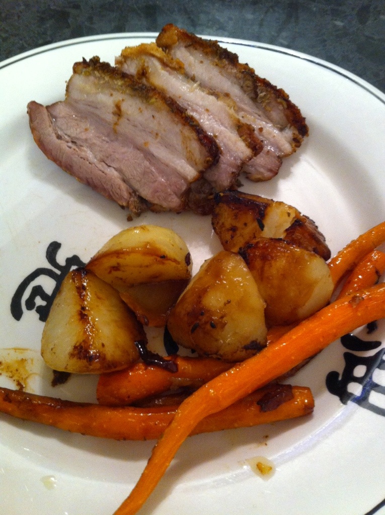Finally I have managed to cook some meat that was nice. Roast pork belly. It was super delicious actually. And the fact that I cooked it in two stages (so we could go and see a Japanese film about ramen) didn’t seem to hinder the final outcome at all.