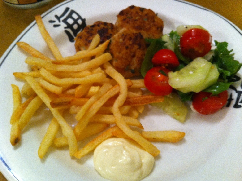 Chicken rissoles with salad and chips. I felt like chips for some reason. I think I was thinking about the amazing chips with mayonnaise we ate a lot of in Europe.