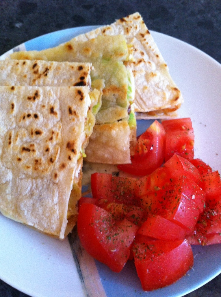 Used some of the leftover karaage chicken from last night to make a chicken quesadilla. Got derby practice tonight. For those of you taking notes, I unfortunately didn’t pass my assessment to move up to level 2, mostly due to the fact that I couldn’t do a plow stop.