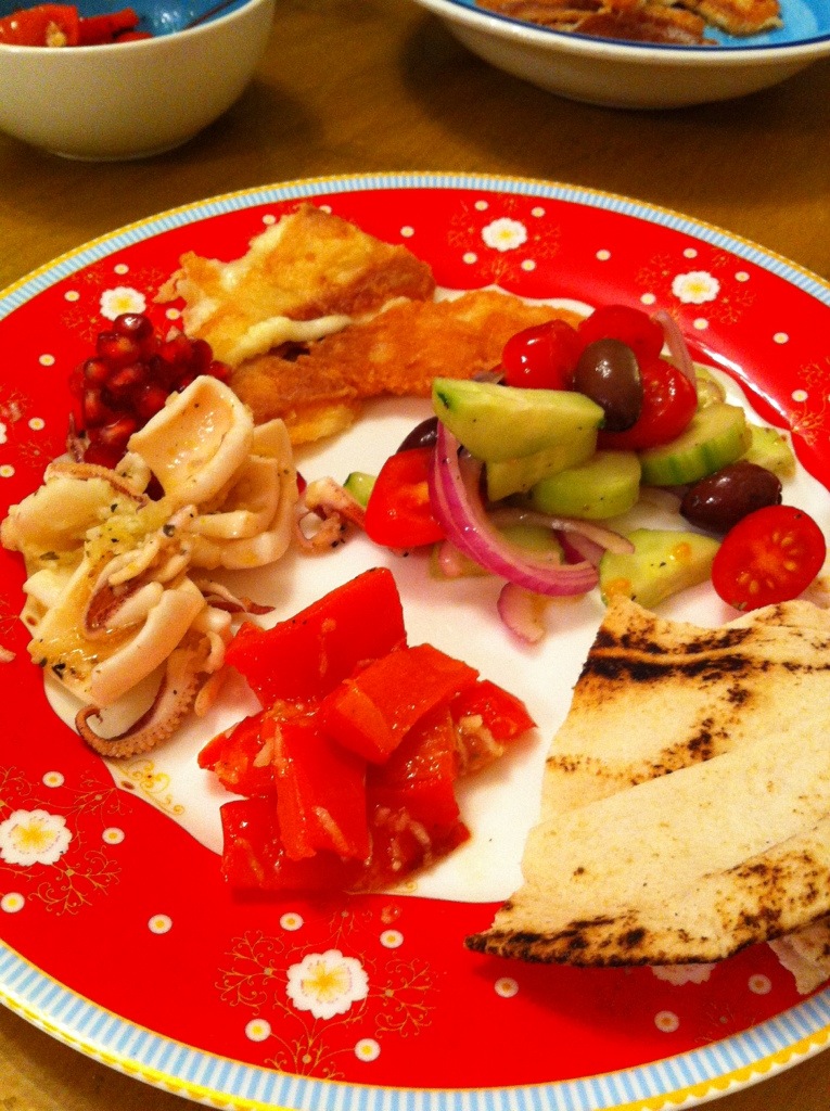 Greek dinner tonight. Squid, salad, red peppers, and Saganaki cheese – which is kinda like haloumi, but even more tasty, if that is actually possible.