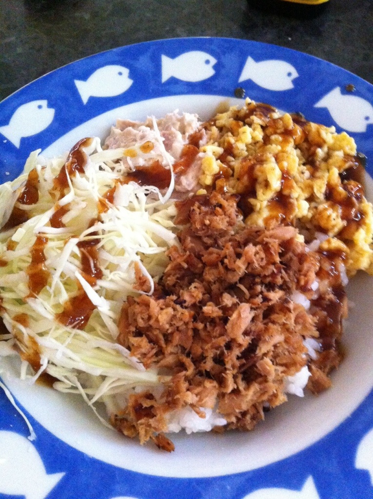 Had leftover tuna from last night, so put it on some rice with some egg (soboro style) and cabbage.