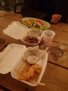 For dinner we headed to Omotosando, where we wanted to go to a place called 246 Common. The Internet told me it was an area that had a whole lot of food trucks and little crafty shops and stuff. After a bit of confusion as to its whereabouts, we eventually found it, and it was super cool. We ended up going to an Okinawan place to try the famous “taco rice” as well as tempura sweet potato, squid and seaweed. The guy selling the food was super friendly and helpful and the food was super delicious!