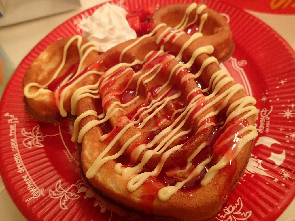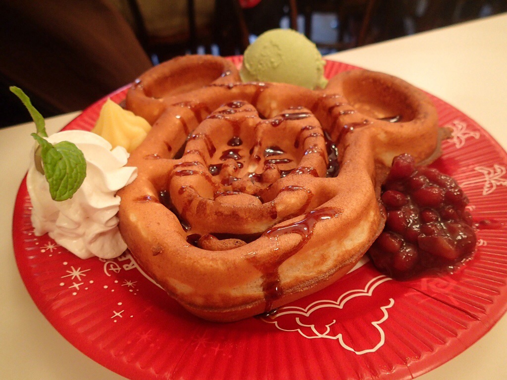 After much wandering around the park, and arvo coffee was in order, so we stopped off for some Mickey waffles. I had strawberry, Steve had the Seasonal Special which included matcha Icecream and adzuki.