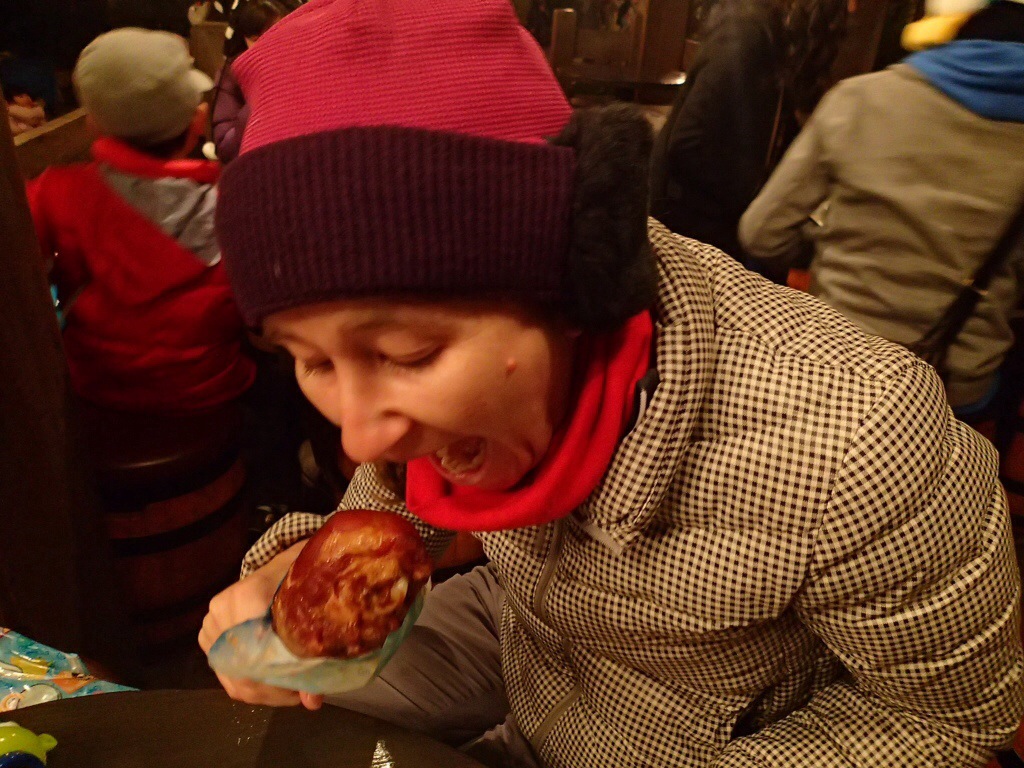 Ok, so on to the food. It was a cold day, so warm food was in order. I can’t believe how many people eat Icecream in the freezing cold – I just can’t do that kind of thing! First up, we had a morning snack of Mickey shaped steamed shrimp & pork buns.