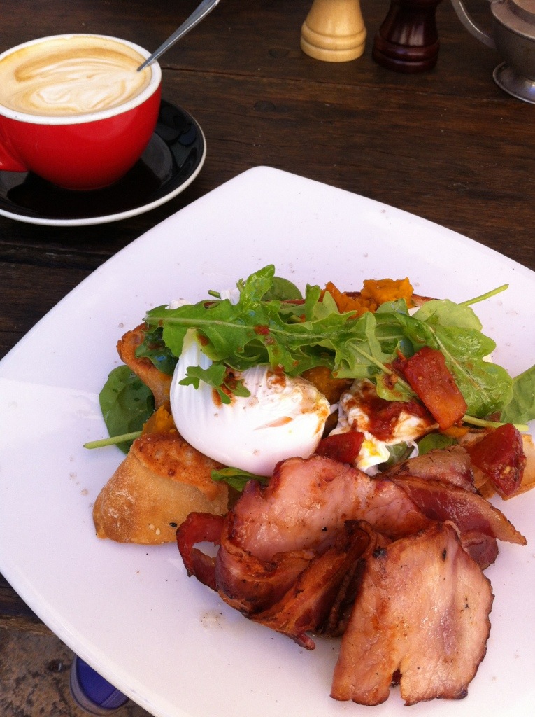 Today we went to Fremantle for lunch at Moore & Moore – one of the few places in Perth that serves consistently good food and coffee. I had poached eggs & bacon with burnt butter and sage mashed pumpkin. It was really good, and besides one little bit of the Turkish bread, I ate it all.