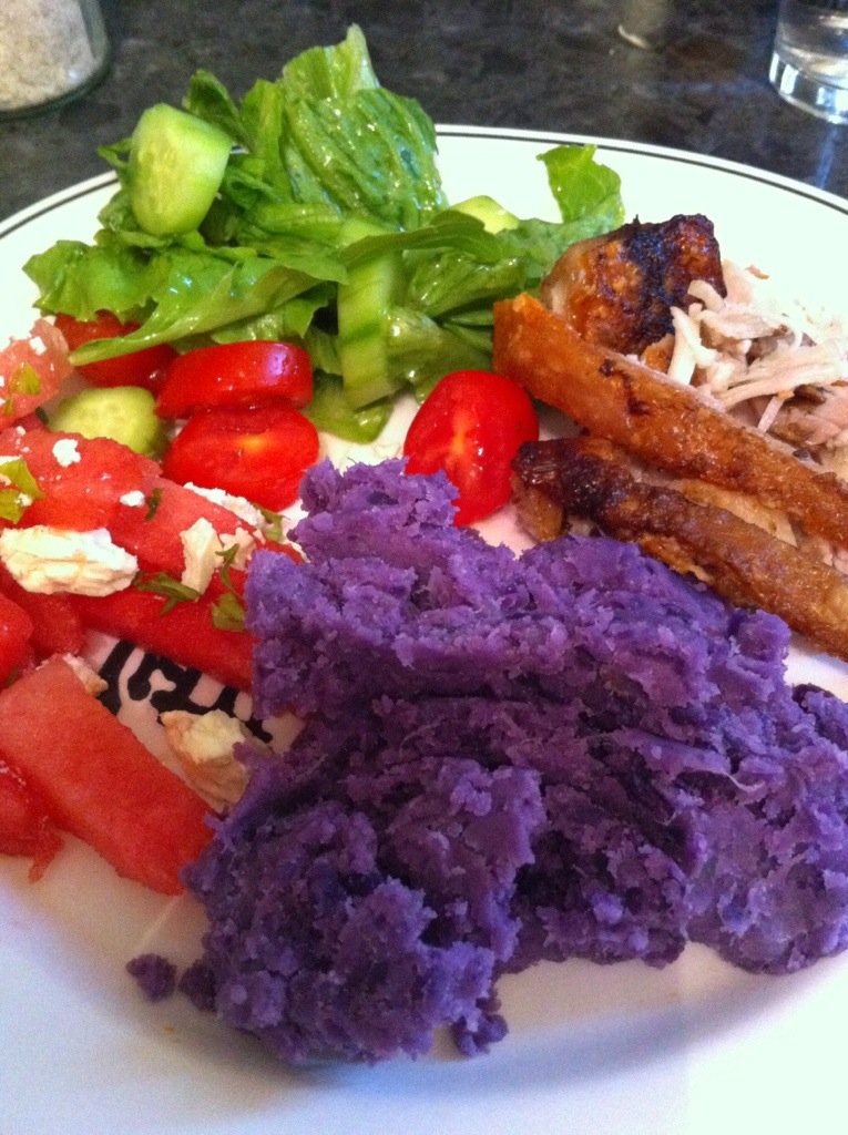 Leftover pork belly with some salads and Okinawan purple sweet potato mash. Except it didn’t mash very well, because its not actually a potato. But it was delicious. Look how purple it is!