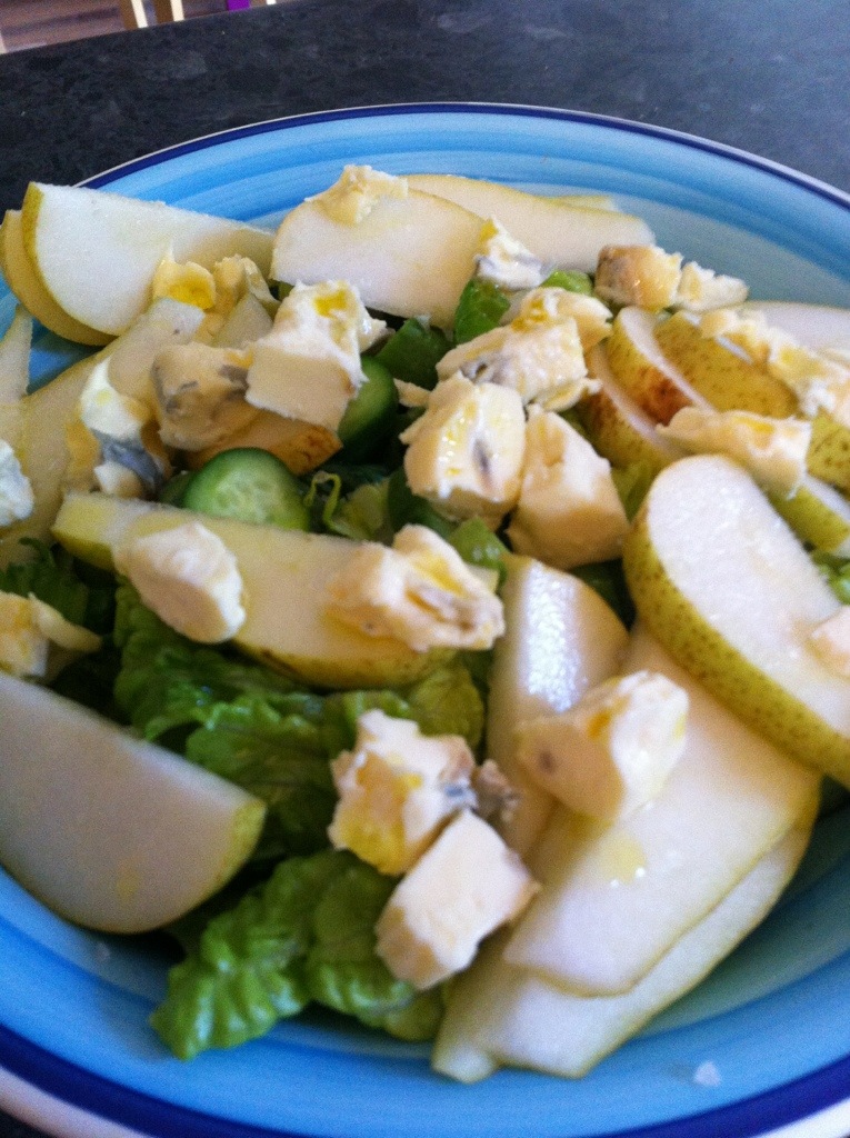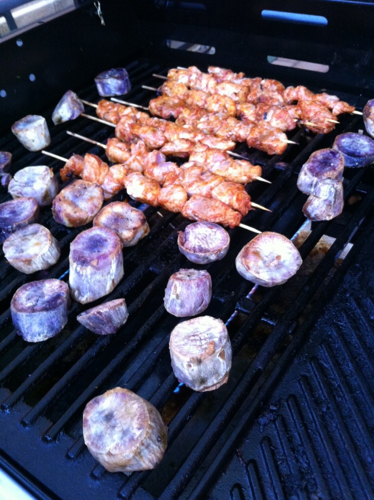 This was a bit of a thrown together meal but ended up being delicious. Spicy garlic chicken skewers cooked on the BBQ. Oven roasted Okinawan purple sweet potato and salad with lettuce, pear and “Shades of Blue” blue cheese.