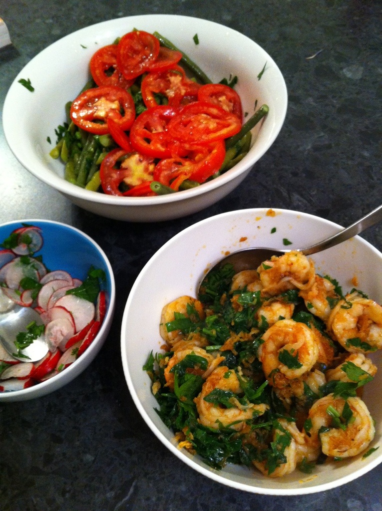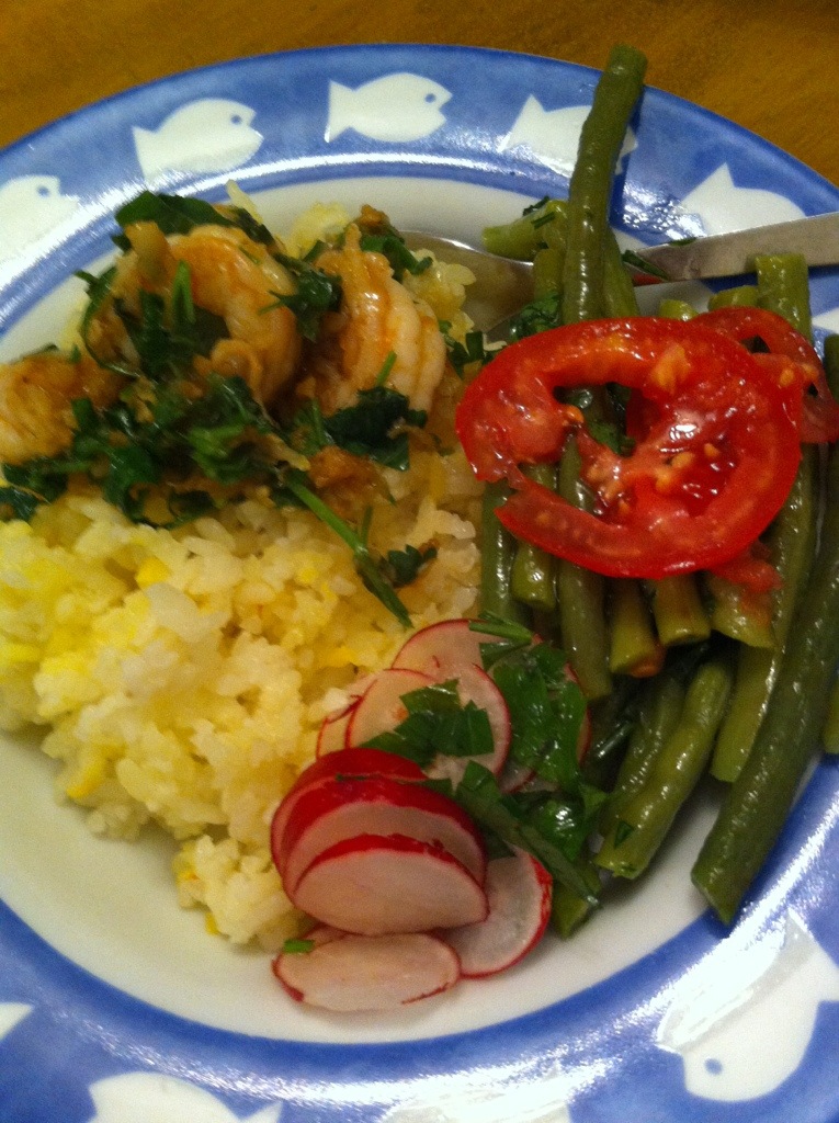 Garlic prawns, saffron rice, green bean salad and radishes.
